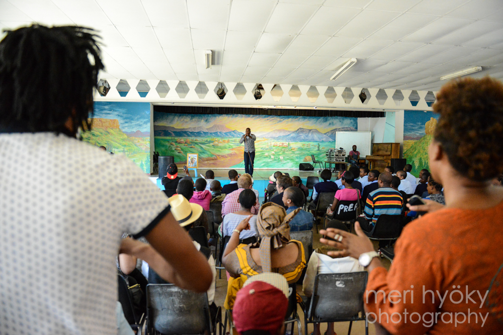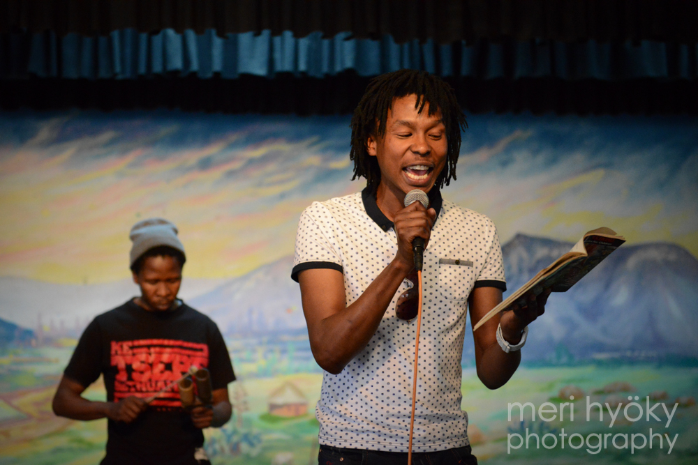 Teboho Moekoa, a local artist, performed a poem that spoke blatantly and scathingly about Lesotho’s current politics: “My people seem mentally possessed / by the same system that keeps them suppressed / And every time they protest / It’s the voter that the voted cannot respect…”