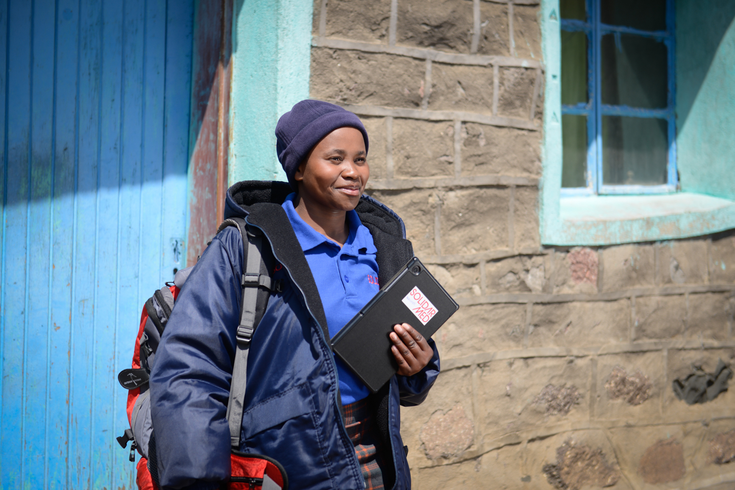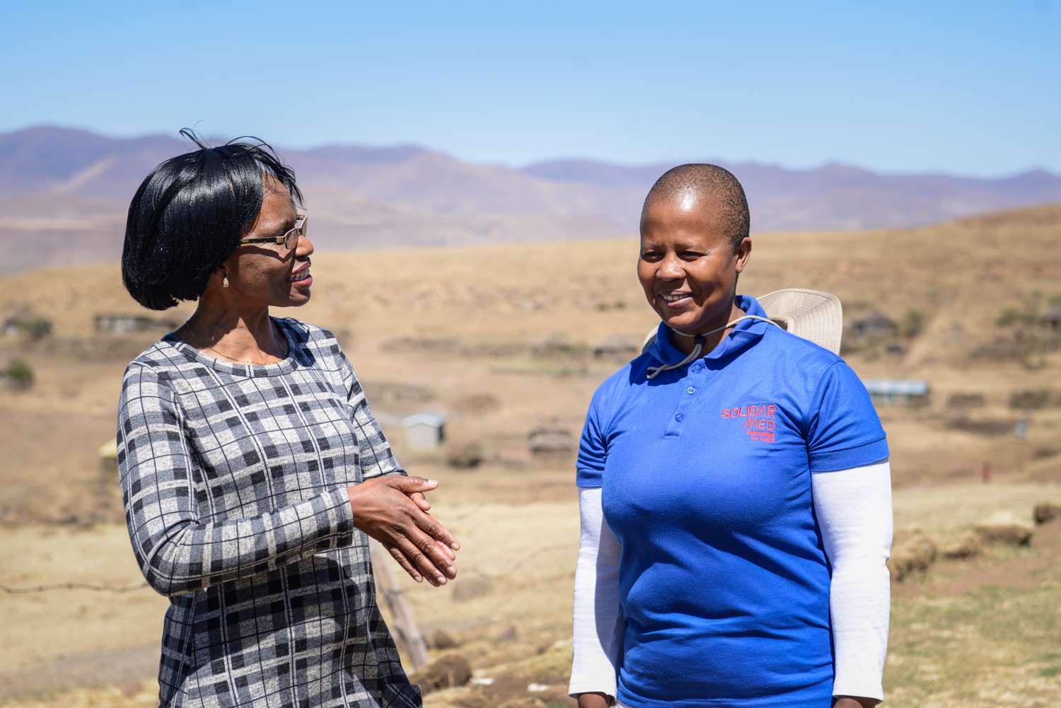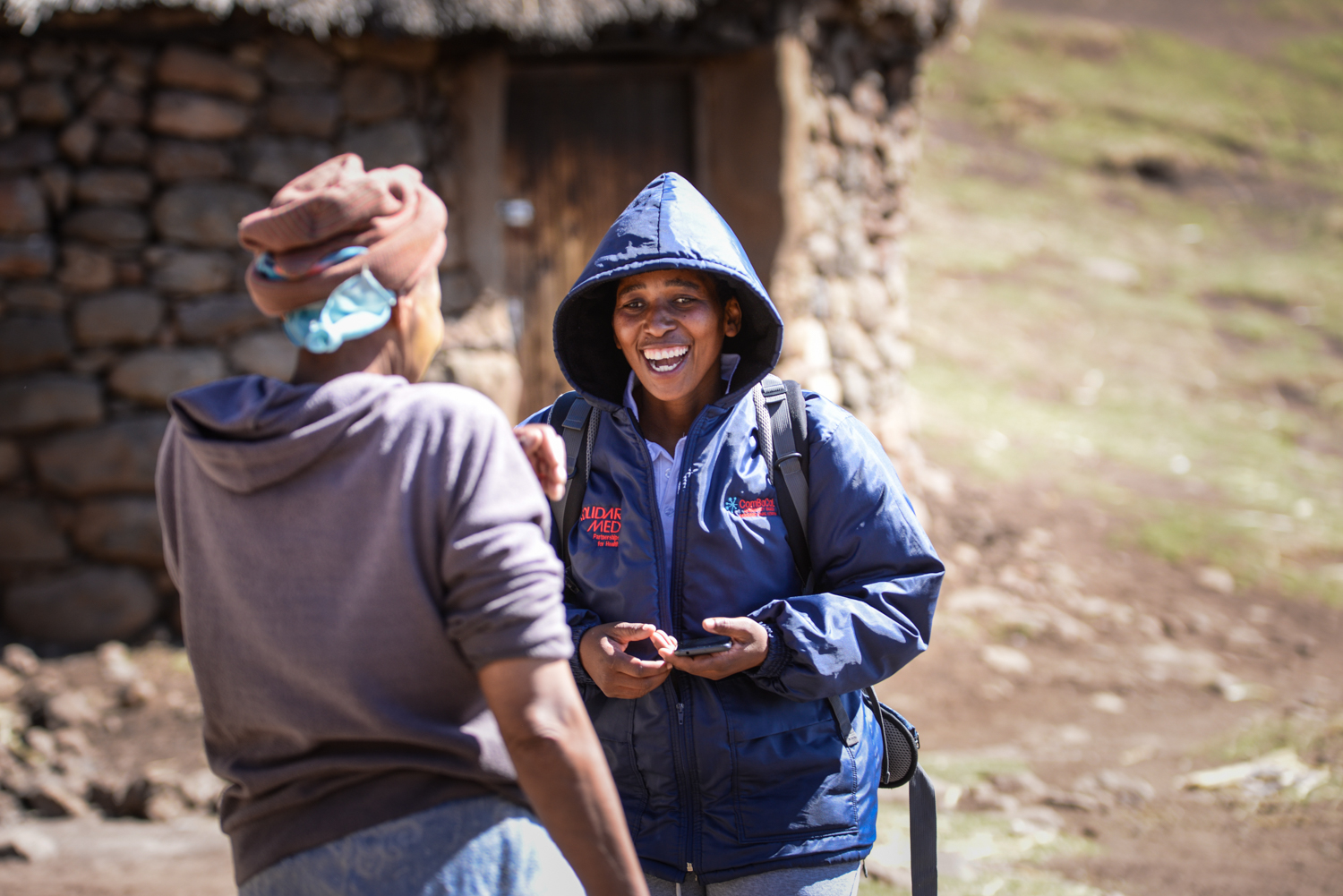 In nearby Ha Taelo, another village situated on the outskirts of Mokhotlong, ‘Mats’oanelo Makaka—also 27 years old—works as a VHW in her community. Dressed in branded SolidarMed gear and with her backpack strapped over her shoulders, Makaka negotiates the village’s high and winding footpaths to visit her patients. The village’s homesteads consist of clusters of rondavels and stone kraals for sheep and cows, and Makaka often comes across her patients as they are going about their everyday work with their animals and in their fields.