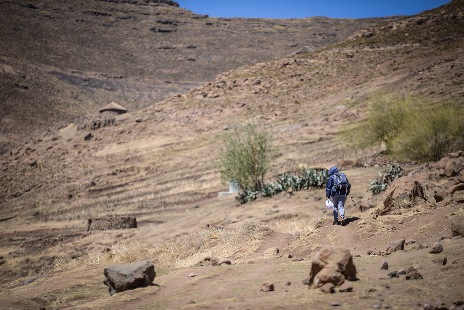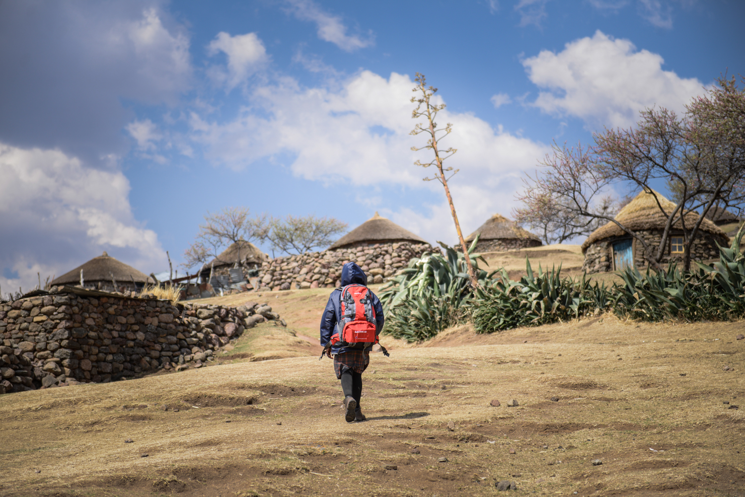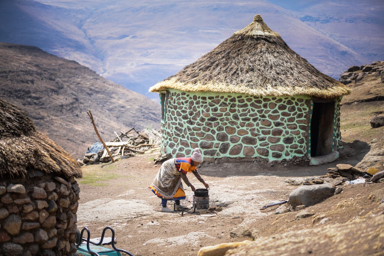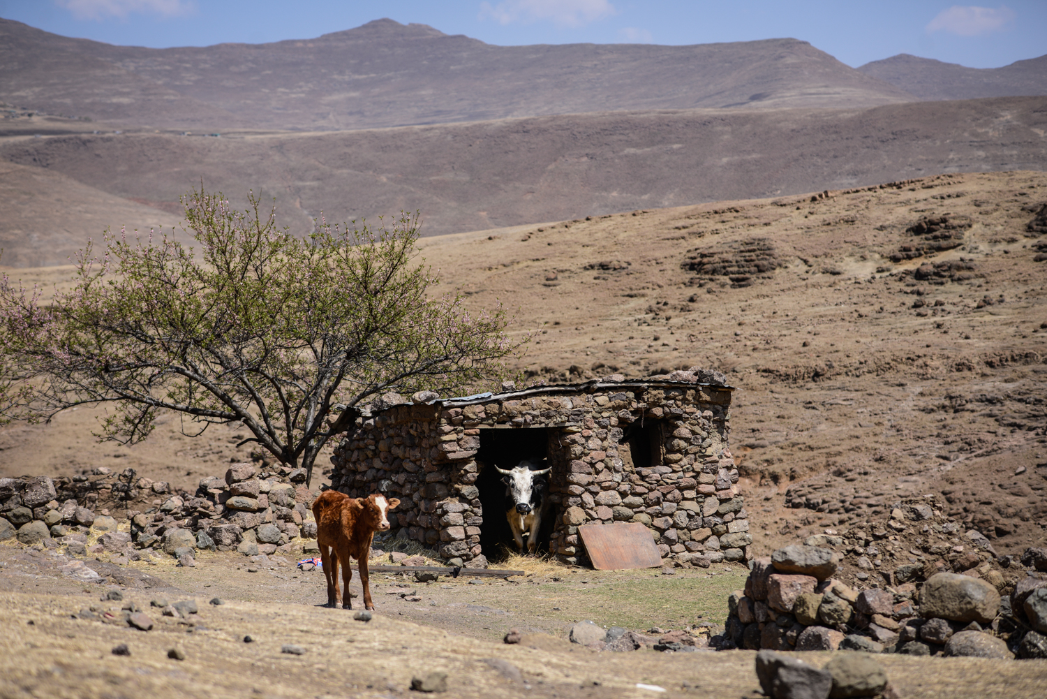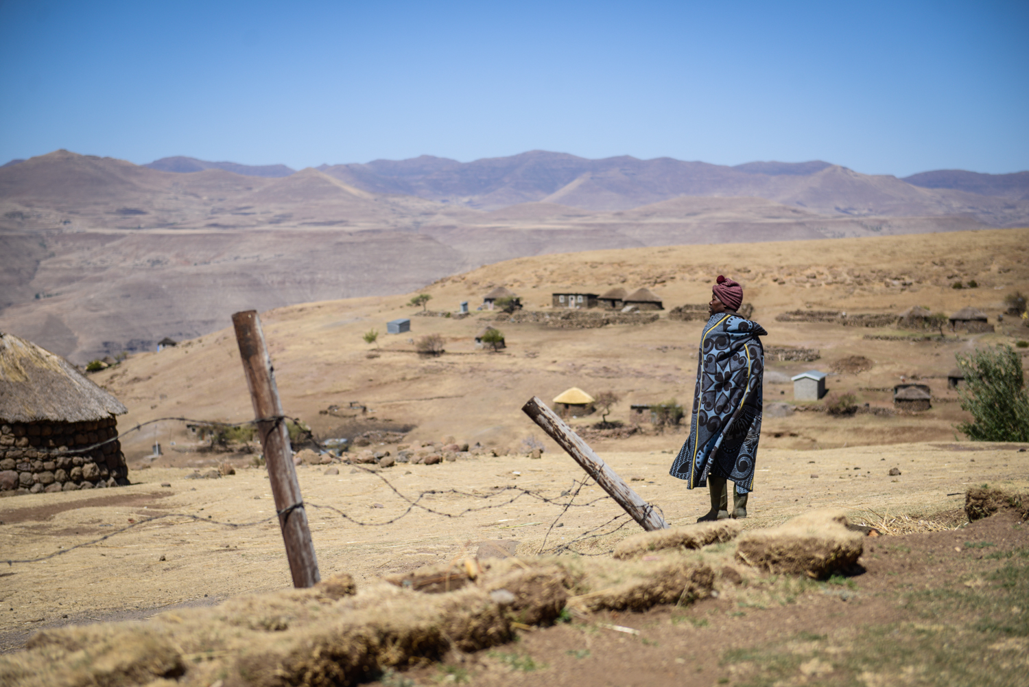 On a chilly day in September 2023, in the remote village of Kholokoe in north-eastern Lesotho, 27-year-old Likabiso Nkune sets out for her day’s work. The village is approximately 30 km away from the town of Mokhotlong and is only accessible by 4×4 vehicles that must navigate a steep and rocky gravel road to reach it. As she walks to work, Nkune passes thatched rondavels, animal kraals, and villagers going about their daily chores of fetching water and firewood. After a long and harsh winter, the early spring has brought bright pink blossoms to the village’s peach trees: bursts of colour against the dry mountainous landscape.
