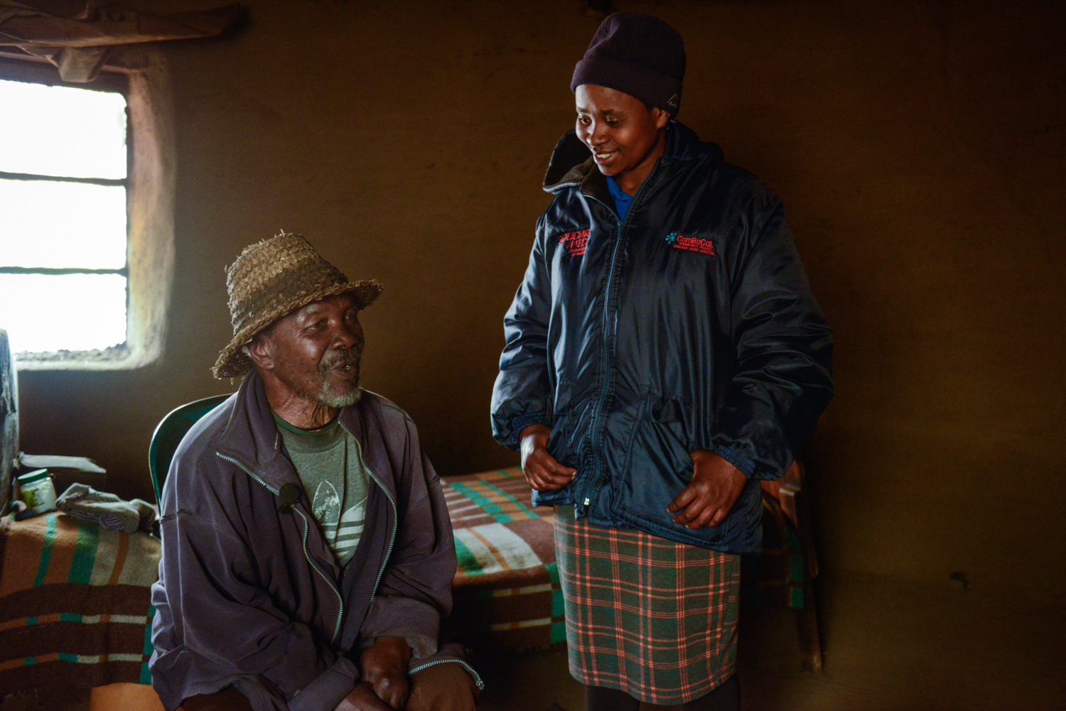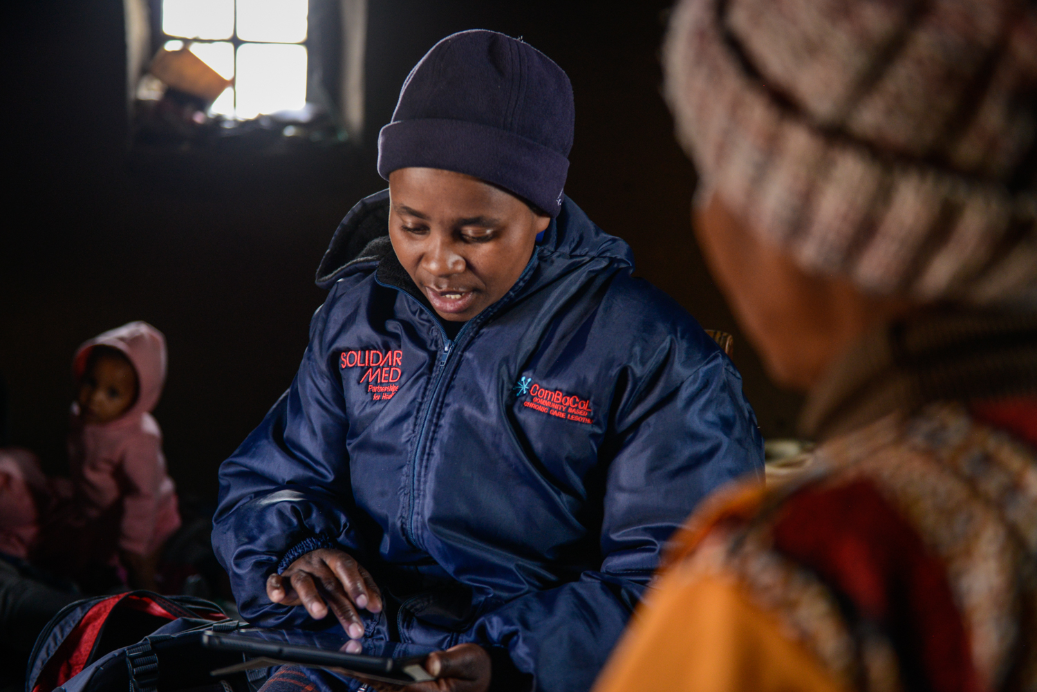 Today, Nkune is visiting 67-year-old ‘Majoalane Mothetho, who was diagnosed with diabetes through the ComBaCaL project. Mothetho meets us at the door of her rondavel, dressed in a warm beanie, an African print dress, and a fleece blanket. She and Nkune sit down together for her check-up, as Nkune pulls out her tablet, goes through Mothetho’s patient details, and then proceeds to test her blood sugar and blood pressure.