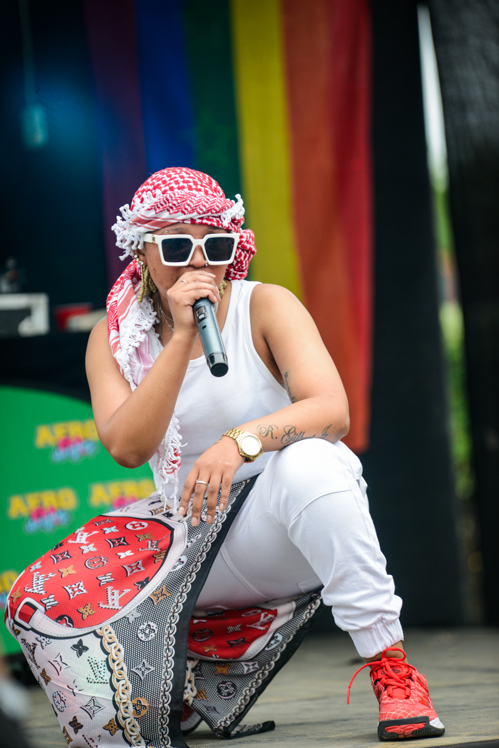 On the field surrounding the stage, more and more people are beginning to arrive, as they gather in groups around food and drinks stalls. As reflective of the extensive work that activists have done in the past few years to increase access to equitable healthcare for LGBTQIA+ Basotho, tents have also been set up by partners such as Sonke Gender Justice, USAID, and the Lesotho Planned Parenthood Association (LPPA). Limpho Ntsihlele, who works with LPPA, explains that the organisation provides stigma-free healthcare services to LGBTQIA+ individuals, including HIV testing and counselling, sexual and reproductive health (SRH) services, and hormone therapy for transgender men. “We’re happy to be at this Pride event,” says Ntsihlele, “and we want to come again next year because discrimination against LGBTQIA+ is still a problem in many health centres in Lesotho. At our facility, our clients don’t hide who they are anymore, and we accept people as they are. We want to continue to advocate for LGBTQIA+ rights.”