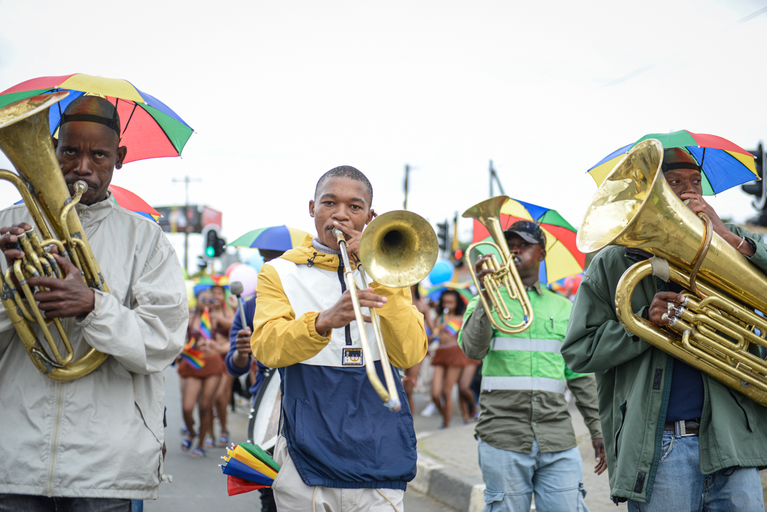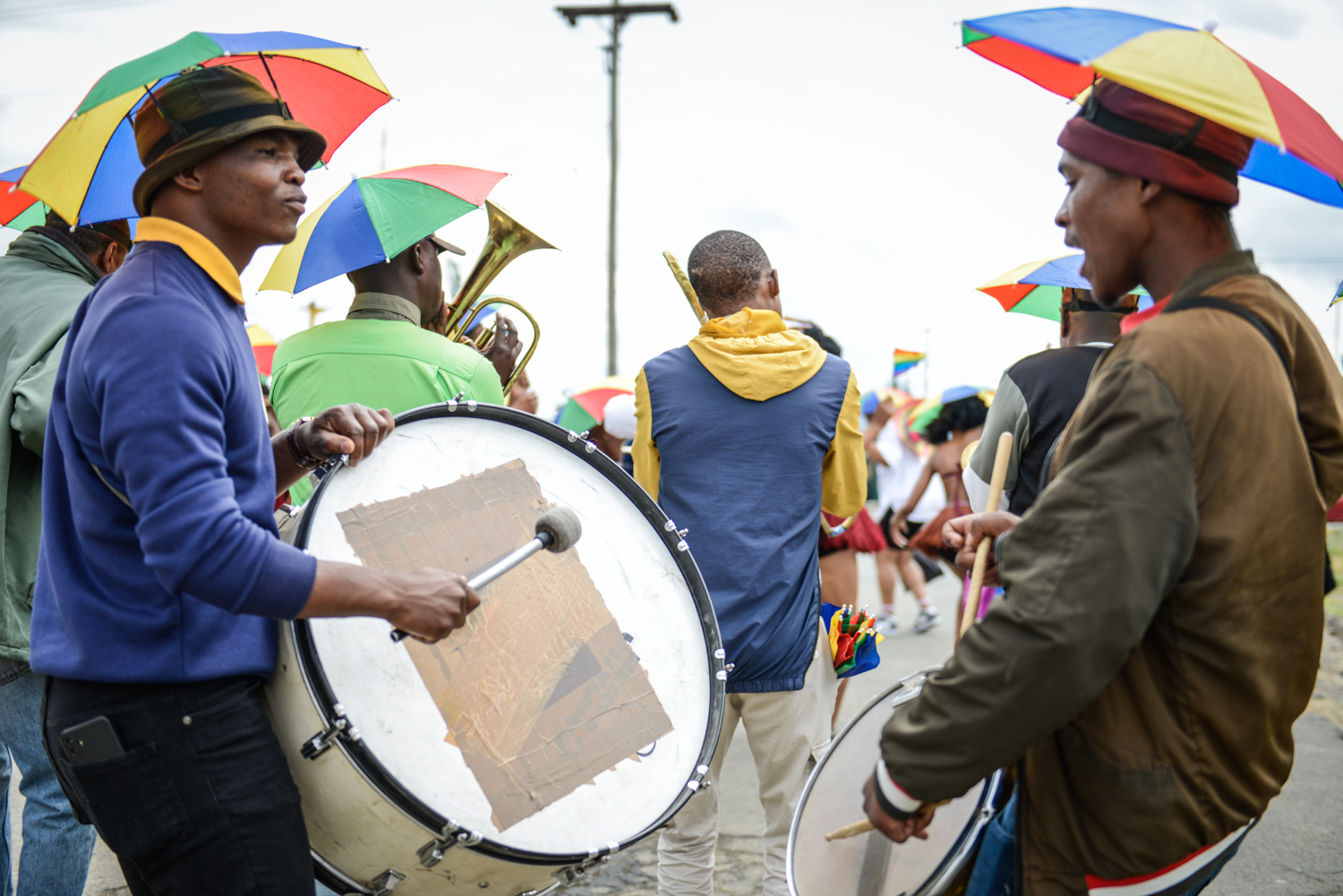Led by the brass band, the march begins, as we make our way down the city centre’s Main South 1 Road. To the sounds of drums, trumpets, cheering, and car hooting, we are a blur of colour and noise as we walk on tarmac and pavements, bringing traffic to a standstill and attracting the curious gazes of many pedestrians and onlookers. When we get to the main traffic circle, with Maseru’s famous sandstone Our Lady of Victory Cathedral to our right, we veer left and walk up to join Mpilo Boulevard, which takes us to our final destination, Maseru Club, where a stage and tents have been set up for speeches, artist performances, and DJ sets that will last late into the night.