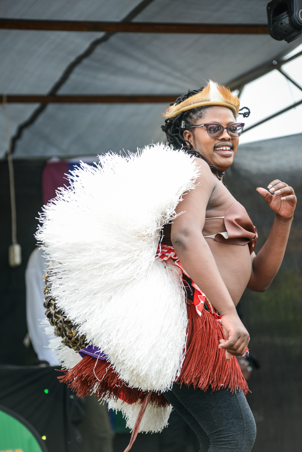 Waiting to go on stage to perform is 38-year-old Madondo “Donddy” Jane, who identifies as gender nonconforming, and who today is wearing a headband, beaded necklaces, a leather bodice, and a thethana skirt. “Biologically I’m male, but today everyone will be surprised because they’ll say, ke bona mosali [I see a woman],” Jane tells me with a smile, switching between English and Sesotho. “I’m going to be dancing litolobonya, which is traditionally a woman’s dance. People will be questioning and there’ll be some attention. I want to make people aware that I am the way I am; you can’t come to me and tell me to change. You can’t come to us and try to correct us. Today is Pride and we’re going to make everybody aware that we exist, and that we also need support. Let’s make discrimination ntho ea maobane [a thing of the past], because we are not going anywhere.”