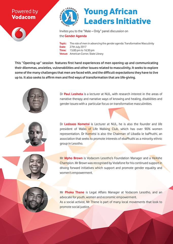 On Thursday July 27 2017, Hub volunteer Ts’episo Mahooe and Hub member Tsebo Makakole took part in a round table discussion on gender with Young African Leaders Initiative Network at The American Corner (State Library) in Maseru. This “opening up” session featured first hand experiences of men opening up and communicating their dilemmas, anxieties, vulnerabilities and other issues relatedContinue reading “Round table discussion on gender with YALI”